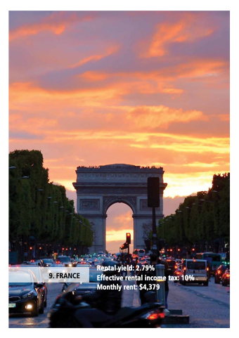 9. FRANCE Rental yield: 2.79% Effective rental income tax: 10% Monthly rent: $4,379