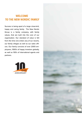 Success is being apart of a large close-knit, happy and caring family. The New Nordic Group is a family company, with family values, that are built into the core of our organisation. Our standard of value is felt from the time one enters any of our resorts, our family villages as well as our sales offi- ces. Our family consists of over 2000 em- ployees, 1000's of happy investors globally, as well as 100's of international agents and partners.