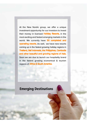 At the New Nordic group, we offer a unique investment opportunity for our investors to invest their money in licensed Holiday Resorts, in the most exciting and fastest emerging markets in the world. We currently have 55 completed and operating resorts. As well, we have new resorts coming up in the fastest growing holiday regions in Thailand, Bali Indonesia, the Philippines, Cambodia and other beautiful and growing regions of Asia. Soon we are due to launch our hospitality brand in the fastest growing economical & tourism regions of Africa & South America.