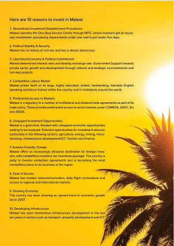 Malawi is a gold mine, flooded with untapped economic opportunities waiting to be explored. Potential opportunities for investment abound, particularly in the following sectors: agriculture, energy, mining, manu- facturing, infrastructure development/ICT, Tourism and finance.