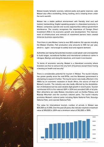 Malawi has a stable political environment with friendly, kind and well trained, hardworking, English speaking people in a liberalized economy. In Malawi, companies operate and access opportunities without government interference. The country recognizes the importance of Foreign Direct Investment (FDI) in its economic growth and development. The improve- ment of infrastructure and removal of investment barriers have created immense business opportunities.