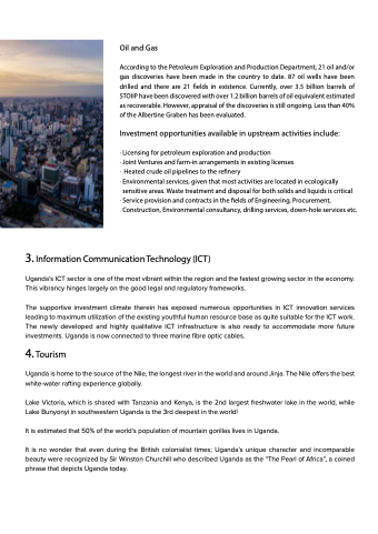 According to the Petroleum Exploration and Production Department, 21 oil and/or gas discoveries have been made in the country to date. 87 oil wells have been drilled and there are 21 fields in existence. Currently, over 3.5 billion barrels of STOIIP have been discovered with over 1.2 billion barrels of oil equivalent estimated as recoverable. However, appraisal of the discoveries is still ongoing. Less than 40% of the Albertine Graben has been evaluated.
