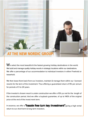 If the investor's chosen resort is under construction we offer a 10% p.a net for the length of the construction period. And we offer a buyback guarantee, of up to 140% of the original price at the end of the invest ment term.