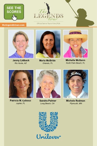 SEE THE SCORES thelegendstour.com Jenny Lidback Maria McBride Michelle McGann Rio Verde, AZ Orlando, FL North Palm Beach, FL Patricia M.-Lebouc Sandra Palmer Michele Redman Jupiter, FL Long Beach, CA Plymouth, MN