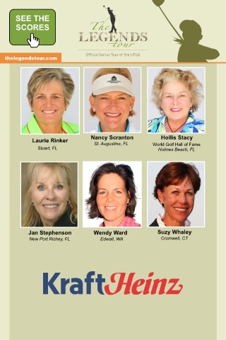 SEE THE SCORES thelegendstour.com Nancy Scranton Hollis Stacy Laurie Rinker St. Augustine, FL World Golf Hall of Fame Stuart, FL Holmes Beach, FL Jan Stephenson Wendy Ward Suzy Whaley New Port Richey, FL Edwall, WA Cromwell, CT