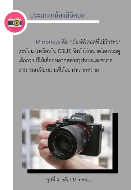 ประเภทกล้องดิจิตอล Mirrorless คือ กล้องดิจิตอลที่ไม่มีกระจก สะท้อน (เหมือนใน DSLR) จึงท ำให้ขนำดโดยรวมดู เล็กกว่ำ มีให้เลือกหลำกหลำยรูปทรงและขนำด สำมำรถเปลี่ยนเลนส์ได้อย่ำงหลำกหลำย รูปที่ 4. กล้อง Mirrorless