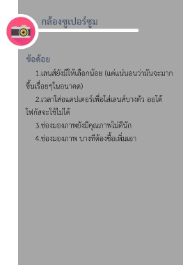 กล้องซูเปอร์ซูม ข้อด้อย 1.เลนส์ยังมีให้เลือกน้อย (แต่แน่นอนว่ำมันจะมำก ขึ้นเรื่อยๆในอนำคต) 2.เวลำใส่อแดปเตอร์เพื่อใส่เลนส์บำงตัว ออโต้ โฟกัสจะใช้ไม่ได้ 3.ช่องมองภำพยังมีคุณภำพไม่ดีนัก 4.ช่องมองภำพ บำงทีต้องซื้อเพิ่มเอำ