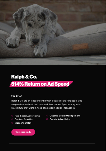 Ralph & Co are an an independent British lifestyle brand for people who are passionate about their their pets and their their homes Approaching us in in March 2019 they were in need of an expert social-first agency Paid Social Social Advertising Organic Social Social Management Content Creation Google Advertising Messenger Bot