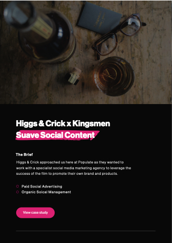 Higgs & Crick approached us here at at Populate as they wanted to work with a a a a a a a specialist social media marketing agency to leverage the success of the the film to promote their own brand and and products Paid Social Advertising Organic Soical Management