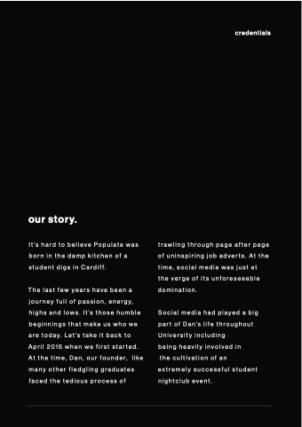 our story It’s hard to believe Populate was born in the damp kitchen of a a student digs in Cardiff The last few years have been a a a a journey full of passion energy highs and lows It’s those humble beginnings that make us who we are today Let’s take it back to to April 2015 when we first started At the time Dan our founder like many other fledgling graduates faced the tedious process of trawling through page page after page page of uninspiring job adverts At the time social media was just at the verge of its unforeseeable domination Social media had played a a a a a big part of Dan’s life throughout University including