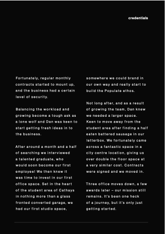 would soon become our first employee! We then knew it was time to invest in in our first office space Set in the heart of of the student area of of Cathays in in nothing more than a a a glass fronted converted garage we had our first studio space somewhere we could brand in our own way and really start to build the Populate ethos Not long after and as a a a a result of growing the team Dan knew we needed a a a larger space Keen to move away from the student area after finding a a a a a half eaten battered sausage in our letterbox We fortunately came across a a a a a a fantastic space in a a a a a a city centre location giving us over double the floor space at a a a very similar cost Contracts were signed and we we moved in Three office moves down a few awards later – our mission still remains It’s been one heck