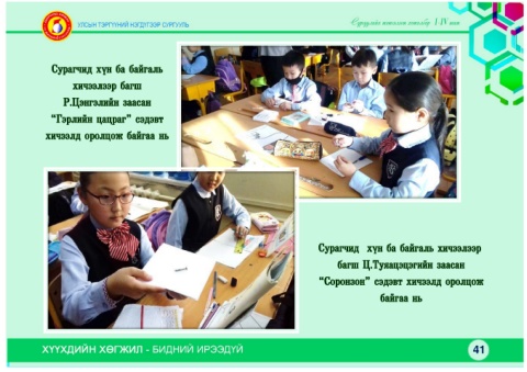 Сурагчид хүн ба байгаль хичээлээр багш Р.Цэнгэлийн заасан “Гэрлийн цацраг” сэдэвт хичээлд оролцож байгаа нь Сурагчид хүн ба байгаль хичээлээр багш Ц.Туяацэцэгийн заасан “Соронзон” сэдэвт хичээлд оролцож байгаа нь 41
