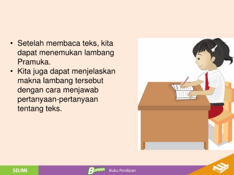 • Setelah membaca teks, kita dapat menemukan lambang Pramuka. • Kita juga dapat menjelaskan makna lambang tersebut dengan cara menjawab pertanyaan-pertanyaan tentang teks.