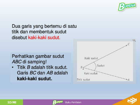 Dua garis yang bertemu di satu titik dan membentuk sudut disebut kaki-kaki sudut. Perhatikan gambar sudut ABC di samping! • Titik B adalah titik sudut. Garis BC dan AB adalah kaki-kaki sudut.