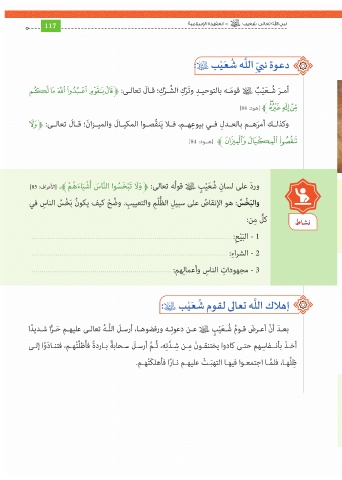 ور َد على لسا ِن ُش َع ْي ٍب قولُه تعالى :ﱫ َو َل تَبْ َخ ُسوا ال َّنا َس أَ ْشيَا َء ُه ْمﱪ[ .الأعراف]85 : نشاط