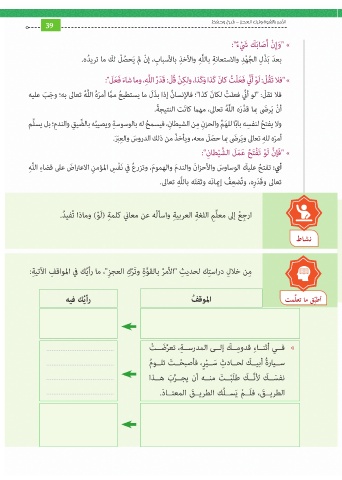 ِمن خلا ِل دراس ِتك لحدي ِث "الأم ُر بالق َّو ِة وتَ ْر ِك العج ِز" ،ما رأيُك في المواق ِف الآتي ِة: