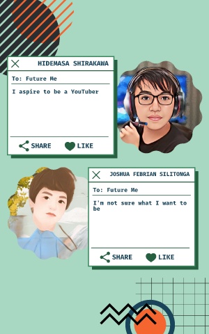 HIDEMASA SHIRAKAWA To: Future Me I aspire to be a YouTuber SHARE LIKE JOSHUA FEBRIAN SILITONGA To: Future Me I'm not sure what I want to be SHARE LIKE