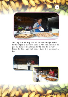 11 Mr. Ong lives an easy life. He can earn enough money for his expenses and saves some in the bank. He likes his job. He thinks it is sufficient for his life. He is very happy. He has a new stall now. I think it is an interesting job.