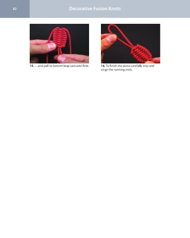 82 Decorative Fusion Knots 15. …and pull its bottom loop taut until firm. 16. To finish the piece carefully snip and singe the running ends.