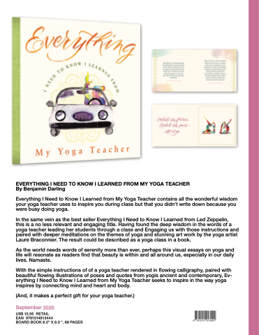 With the simple instructions of of a yoga teacher rendered in flowing calligraphy, paired with beautiful flowing illustrations of poses and quotes from yogis ancient and contemporary, Ev- erything I Need to Know I Learned from My Yoga Teacher seeks to inspire in the way yoga inspires by connecting mind and heart and body.