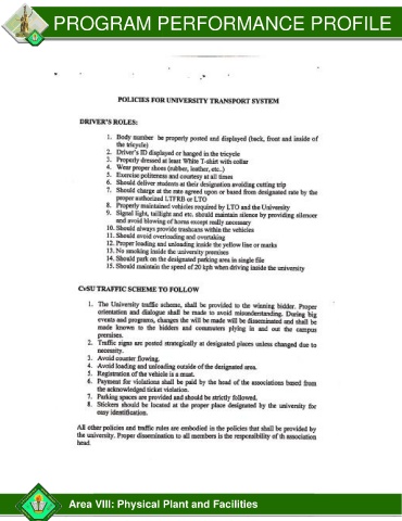 PROGRAM PERFORMANCE PROFILE Area VIII: Physical Plant and Facilities