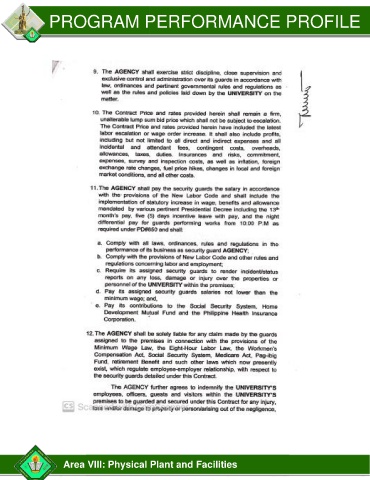 PROGRAM PERFORMANCE PROFILE Area VIII: Physical Plant and Facilities