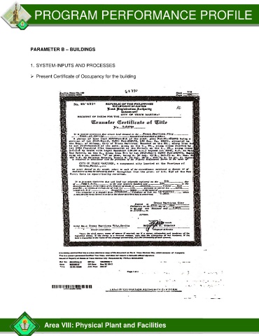 PROGRAM PERFORMANCE PROFILE PARAMETER B – BUILDINGS 1. SYSTEM-INPUTS AND PROCESSES ➢ Present Certificate of Occupancy for the building Area VIII: Physical Plant and Facilities