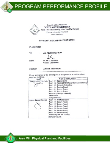 PROGRAM PERFORMANCE PROFILE Area VIII: Physical Plant and Facilities