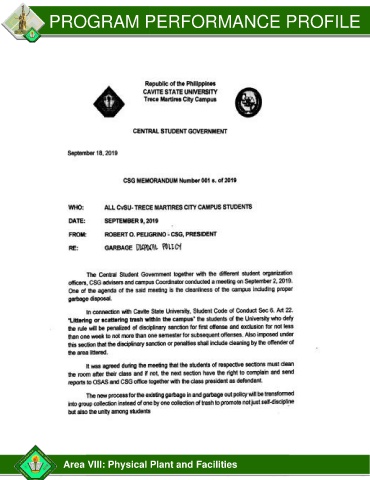 PROGRAM PERFORMANCE PROFILE Area VIII: Physical Plant and Facilities
