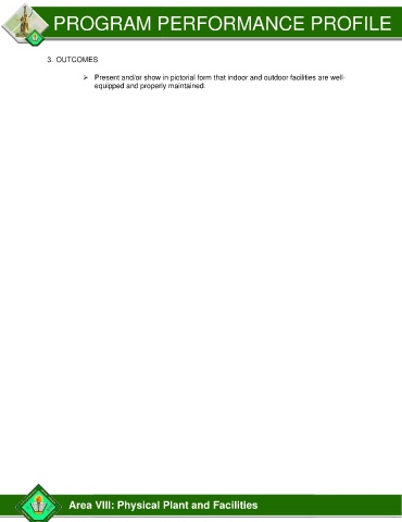 PROGRAM PERFORMANCE PROFILE 3. OUTCOMES ⮚ Present and/or show in pictorial form that indoor and outdoor facilities are well- equipped and properly maintained. Area VIII: Physical Plant and Facilities
