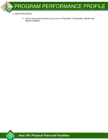 PROGRAM PERFORMANCE PROFILE 4. BEST PRACTICES ⮚ Cite as many best practices as you can on Parameter E (Assembly, Athletic and Sports Facilities). Area VIII: Physical Plant and Facilities