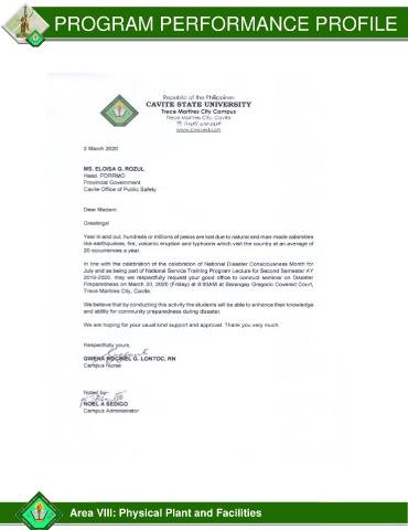 PROGRAM PERFORMANCE PROFILE Area VIII: Physical Plant and Facilities