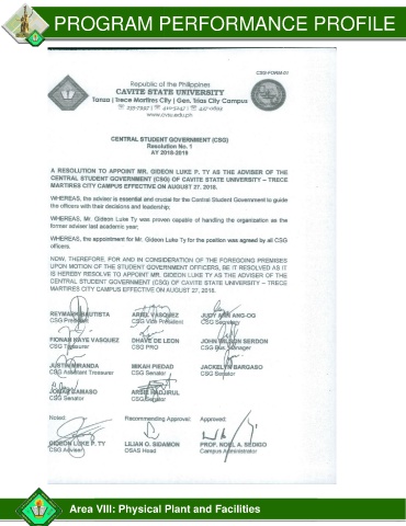 PROGRAM PERFORMANCE PROFILE Area VIII: Physical Plant and Facilities