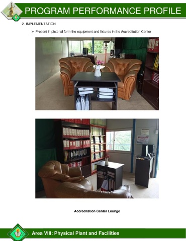 PROGRAM PERFORMANCE PROFILE 2. IMPLEMENTATION ➢ Present in pictorial form the equipment and fixtures in the Accreditation Center Accreditation Center Lounge Area VIII: Physical Plant and Facilities