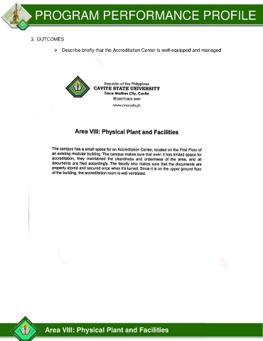PROGRAM PERFORMANCE PROFILE 3. OUTCOMES ➢ Describe briefly that the Accreditation Center is well-equipped and managed Area VIII: Physical Plant and Facilities