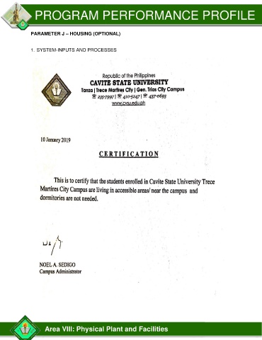 PROGRAM PERFORMANCE PROFILE PARAMETER J – HOUSING (OPTIONAL) 1. SYSTEM-INPUTS AND PROCESSES Area VIII: Physical Plant and Facilities