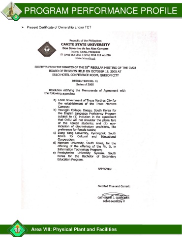 PROGRAM PERFORMANCE PROFILE ➢ Present Certificate of Ownership and/or TCT Area VIII: Physical Plant and Facilities