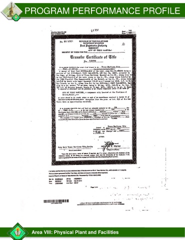 PROGRAM PERFORMANCE PROFILE Area VIII: Physical Plant and Facilities