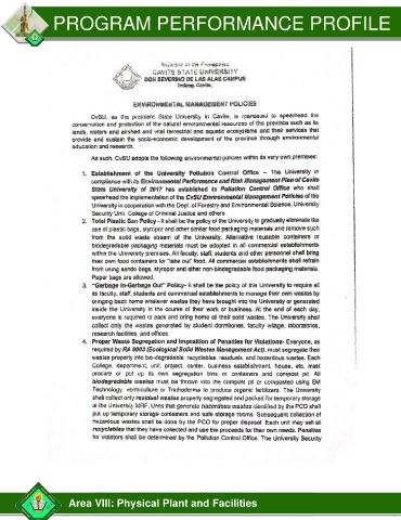 PROGRAM PERFORMANCE PROFILE Area VIII: Physical Plant and Facilities