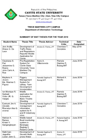 SUMMARY OF BSIT THESES FOR THE YEAR 2019