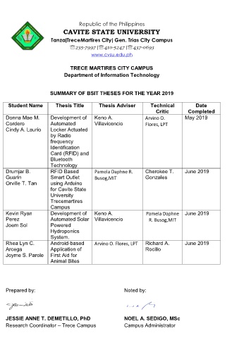 SUMMARY OF BSIT THESES FOR THE YEAR 2019