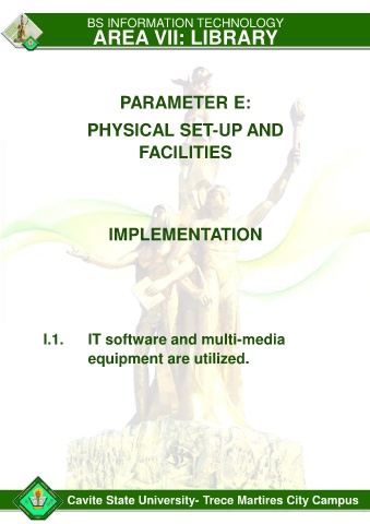 BS INFORMATION TECHNOLOGY AREA VII: LIBRARY PARAMETER E: PHYSICAL SET-UP AND FACILITIES IMPLEMENTATION I.1. IT software and multi-media equipment are utilized. Cavite State University- Trece Martires City Campus