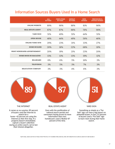 Something as simple as a “For Sale” sign can have a big impact on potential buyers. In fact, 51 percent of buyers used a “For Sale” sign to learn more during their home search.
