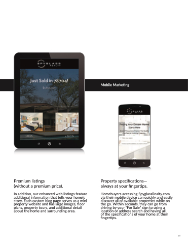 Homebuyers accessing SpyglassRealty.com via their mobile device can quickly and easily discover all of available properties while on the go. Within seconds, they can go from driving by your “For Sale” sign to using a location or address search and having all