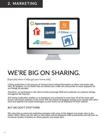 Listing syndication is the process of ‘sharing’ home listing information on other real estate web sites. At Spyglass, it’s our belief that we should cast a wide net and provide as much exposure for our listings as possible.