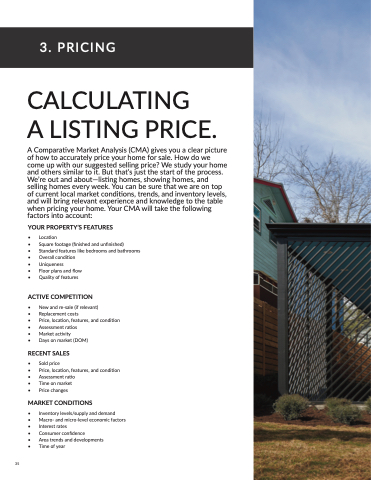 A Comparative Market Analysis (CMA) gives you a clear picture of how to accurately price your home for sale. How do we come up with our suggested selling price? We study your home and others similar to it. But that’s just the start of the process. We’re out and about—listing homes, showing homes, and selling homes every week. You can be sure that we are on top of current local market conditions, trends, and inventory levels, and will bring relevant experience and knowledge to the table when pricing your home. Your CMA will take the following factors into account: