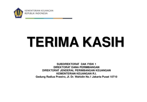 KEMENTERIAN KEUANGAN REPUBLIK INDONESIA TERIMA KASIH SUBDIREKTORAT DAK FISIK 1 DIREKTORAT DANA PERIMBANGAN DIREKTORAT JENDERAL PERIMBANGAN KEUANGAN KEMENTERIAN KEUANGAN R.I. Gedung Radius Prawiro, Jl. Dr. Wahidin No.1 Jakarta Pusat 10710 41