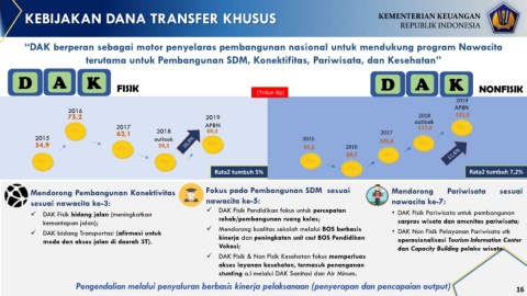 DAK bidang Transportasi (afirmasi untuk kinerja dan peningkatan unit cost BOS Pendidikan • DAK Non Fisik Pelayanan Pariwisata utk