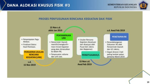 DANA ALOKASI KHUSUS FISIK #3 KEMENTERIAN KEUANGAN REPUBLIK INDONESIA PROSES PENYUSUNAN RENCANA KEGIATAN DAK FISIK 19 Okt - Nov • Penetapan Alokasi DAK per daerah (perpres rincian APBN) • Penyusunan Juknis DAK (Perpres)