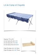 Lit de Camp et Clayette Hauteur 73 ou 53 Lit de Camp Alu 2m 45€ Lit de Camp Alu 1m 35€ Lit de Camp Acier 2m 65€ Claie Rouleau 2m 50€ Bois Claie Rouleau 2m 60€ Tissu 33